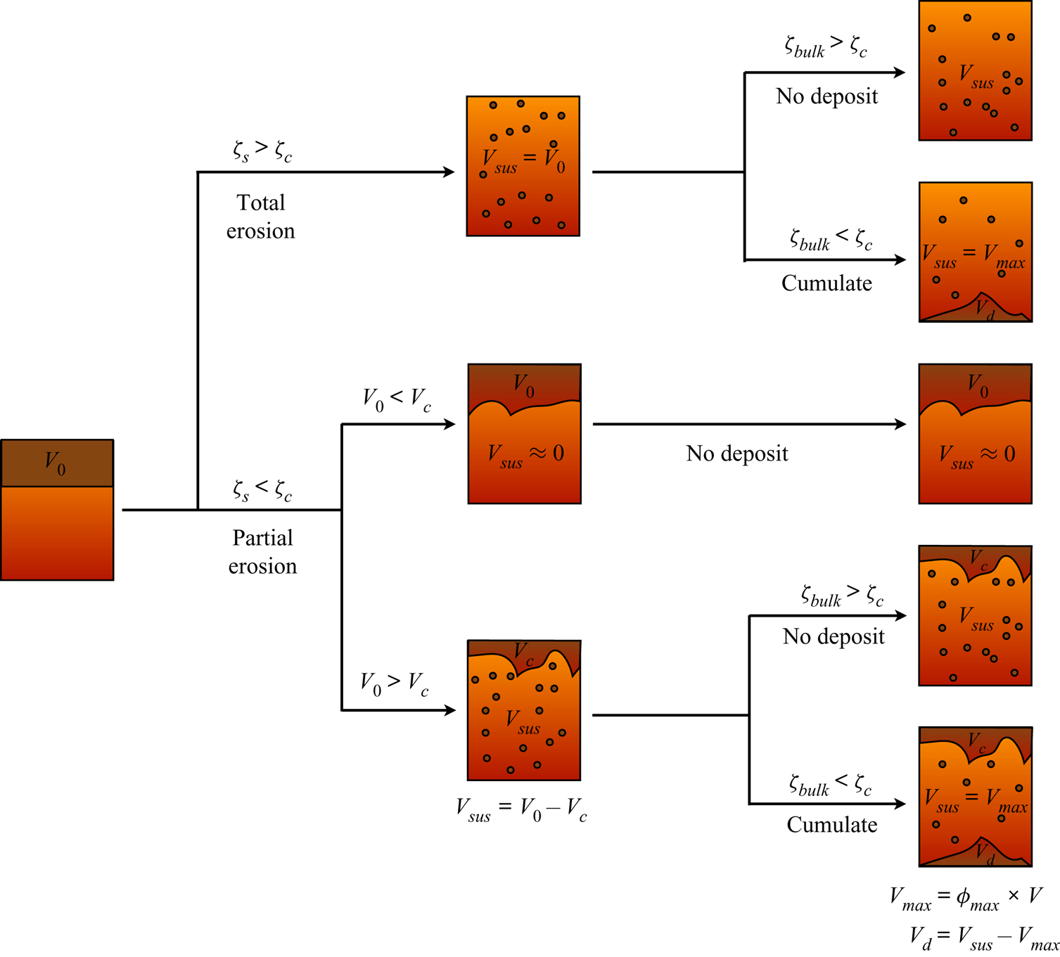 Erosion and re-entrainment from settled cumulates and/or floating lids bring particles back in suspension (Solomatov et al. Reference Solomatov, Olson and Stevenson1993). However, the framework that describes this phenomenon is different from the one used to treat suspensions as it depends on local mechanical equilibrium of the particles (Charru et al. Reference Charru, Mouilleron and Eiff2004; Lajeunesse et al. Reference Lajeunesse, Malverti and Charru2010). Particles at the surface of the bed are submitted to two forces: (i) the frictional force between the particles and the underlying bed that captures particles at the surface of the bed and is proportional to the particles buoyancy according to Coulomb's law and (ii) the shear stress induced by the flow. A dimensionless number, called the Shields number, compares these two forces (Shields Reference Shields1936)