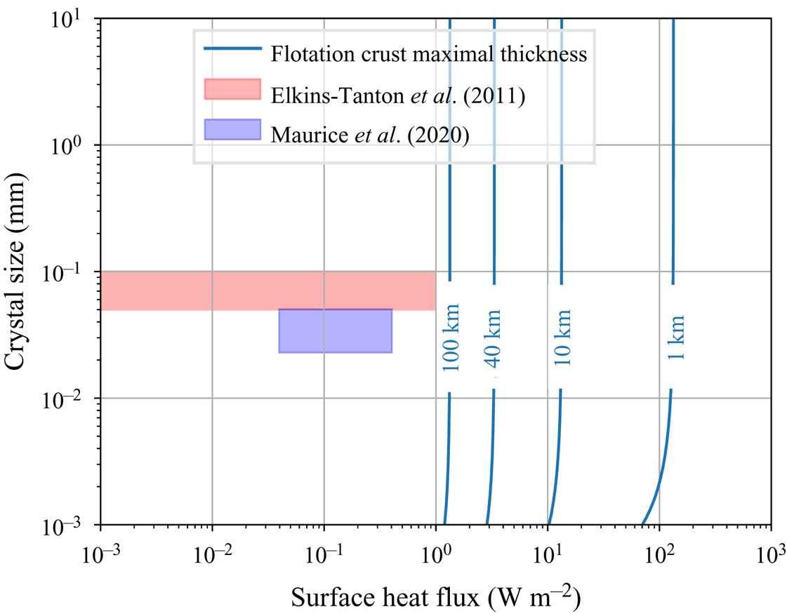 Figure 15. Evolution of the maximal thickness of the anorthosite crust formed by plagioclase flotation above the lunar magma ocean as a function of the crystal size and the surface heat flux. We represent also the range of surface heat flux that is simulated by two thermal models (Elkins-Tanton et al. Reference Elkins-Tanton, Burgess and Yin2011; Maurice et al. Reference Maurice, Tosi, Schwinger, Breuer and Kleine2020).