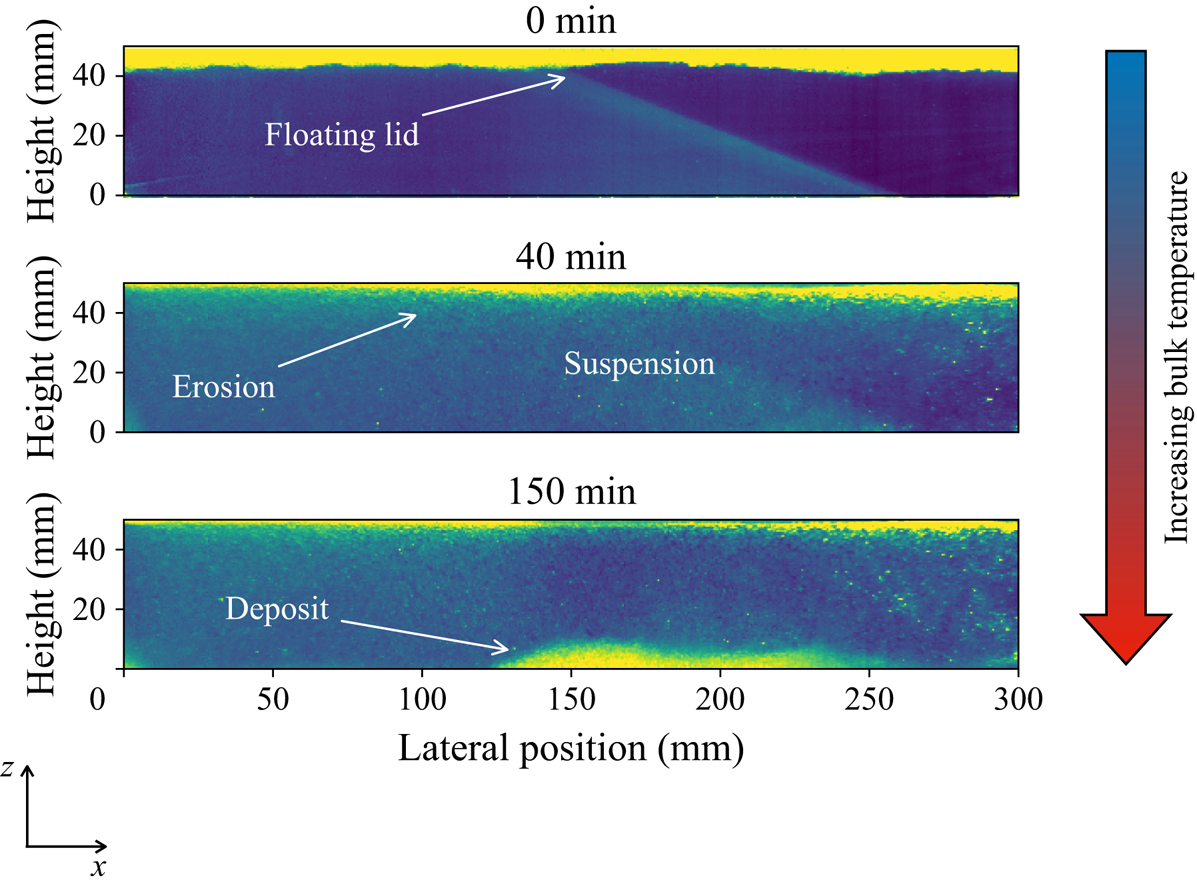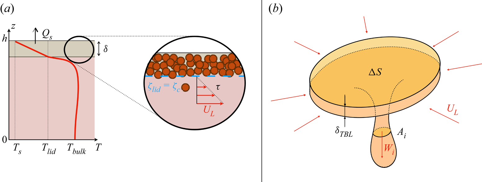 $0.1\text {--}0.2$ (Charru, Mouilleron & Eiff Reference Charru, Mouilleron and Eiff2004). This model was used to determine sediment transport upon bedloads (Lajeunesse, Malverti & Charru Reference Lajeunesse, Malverti and Charru2010) and the equilibrium height of the settled bed (Leighton & Acrivos Reference Leighton and Acrivos1986). However, these studies refer to experiments that involve controlled flow, with isoviscous and isothermal conditions, that are not consistent with the geophysical applications considered here. Convection in magmatic reservoirs involves destabilization of thermal boundary layers (TBLs) that complexifies both temperature and velocity fields. Solomatov et al. (Reference Solomatov, Olson and Stevenson1993) adapted the previous reasoning by considering that a single particle in the TBL cannot be lifted, but is moved horizontally at the surface of the bed by the tangential stress. Then, particles form dunes that make the stress quasi-vertical, enabling entrainment. However, these authors do not study the equilibrium thickness of the underlying bed, or its influence on the thermal state.