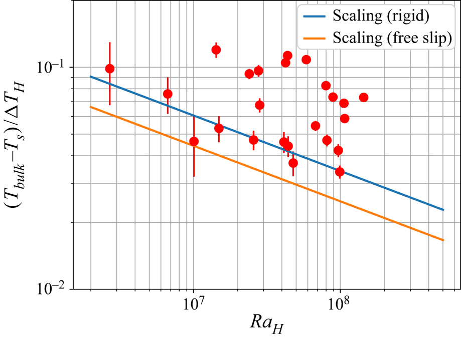 $Ra_{H}\in [3.10^{6},\ 10^{8}]$. According to the theory by Grossmann & Lohse (Reference Grossmann and Lohse2000), partially crystallized magma oceans and our experiments occur in the same regime of convection.