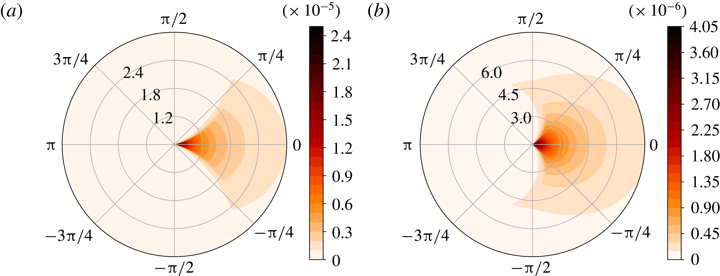 ). This makes it possible to study the scattering of ITs generated by a localised source such as a topographic ridge. Ponte & Klein (Reference Ponte and Klein2015) and Dunphy et al. (Reference Dunphy, Ponte, Klein and Le Gentil2017) recently used three-dimensional Boussinesq simulations to study this problem and quantify the temporal incoherence of the ITs that results from the presence of a time-dependent turbulent flow. (See also Kelly et al. (Reference Kelly, Lermusiaux, Duda and Haley2016) and Kelly & Lermusiaux (Reference Kelly and Lermusiaux2016) for simulations of ITs in realistic configurations.) We carry out shallow-water simulations in a set-up analogous to theirs, and compare the results with direct solutions of the kinetic equation. This provides an estimate for the length scale over which the wave field becomes isotropic and, more broadly, sheds light on the interplay between transport of the wave energy by the group velocity and scattering. We emphasise that our theory concentrates on the statistical properties of the IT energy and makes no predictions for their phase. In the regime we consider, with a flow assumed to vary on a time scale much larger than the tidal period, the stationarity of the turbulent-energy spectrum ensures that the tidal energy remains concentrated at the single wavenumber dictated by the fixed tide frequency.