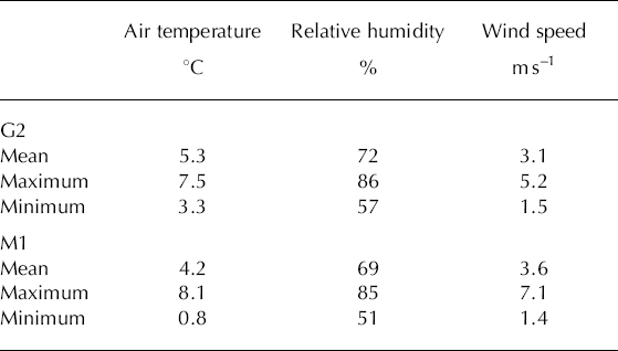 Although we measured wind speed, air temperature and humidity at different levels, we calculated the turbulent heat fluxes using the bulk method (e.g. Reference MunroMunro, 1989). A profile method is not suitable here, since the difference between the wind speed at the two levels at G2 (1.70 and 3.05 m) is too small. The 3.05 m wind speed is on average only 0.01 m s−1 higher than the 1.70 m wind speed, and only during 32% of the measurement period does wind speed at 3.05 m exceed the wind speed at 1.70 m by more than the accuracy of the sensor (Table 1). This suggests a shallow katabatic flow with a wind-speed maximum at only a few meters above the surface. Under these conditions, a profile method cannot be used (Reference Denby and GreuellDenby and Greuell, 2000).
