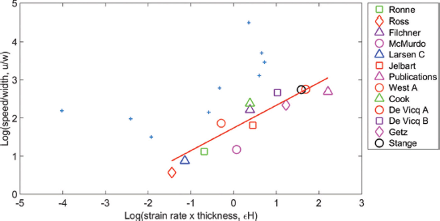 Figure 1 (Reference AlleyAlley and others, 2008) shows data points corresponding to individual ice-shelf locations, and the linear regression used to derive the empirical relationship. The dataset used is made up of 18 data points from ten ice shelves (named in the caption to Fig. 1). A number of shelves have multiple data points corresponding to different locations on the ice shelf. The dataset is a compilation of data from numerous sources, with no apparent systematic methodology for sampling parameter values, especially with regard to along-flow strain rate.