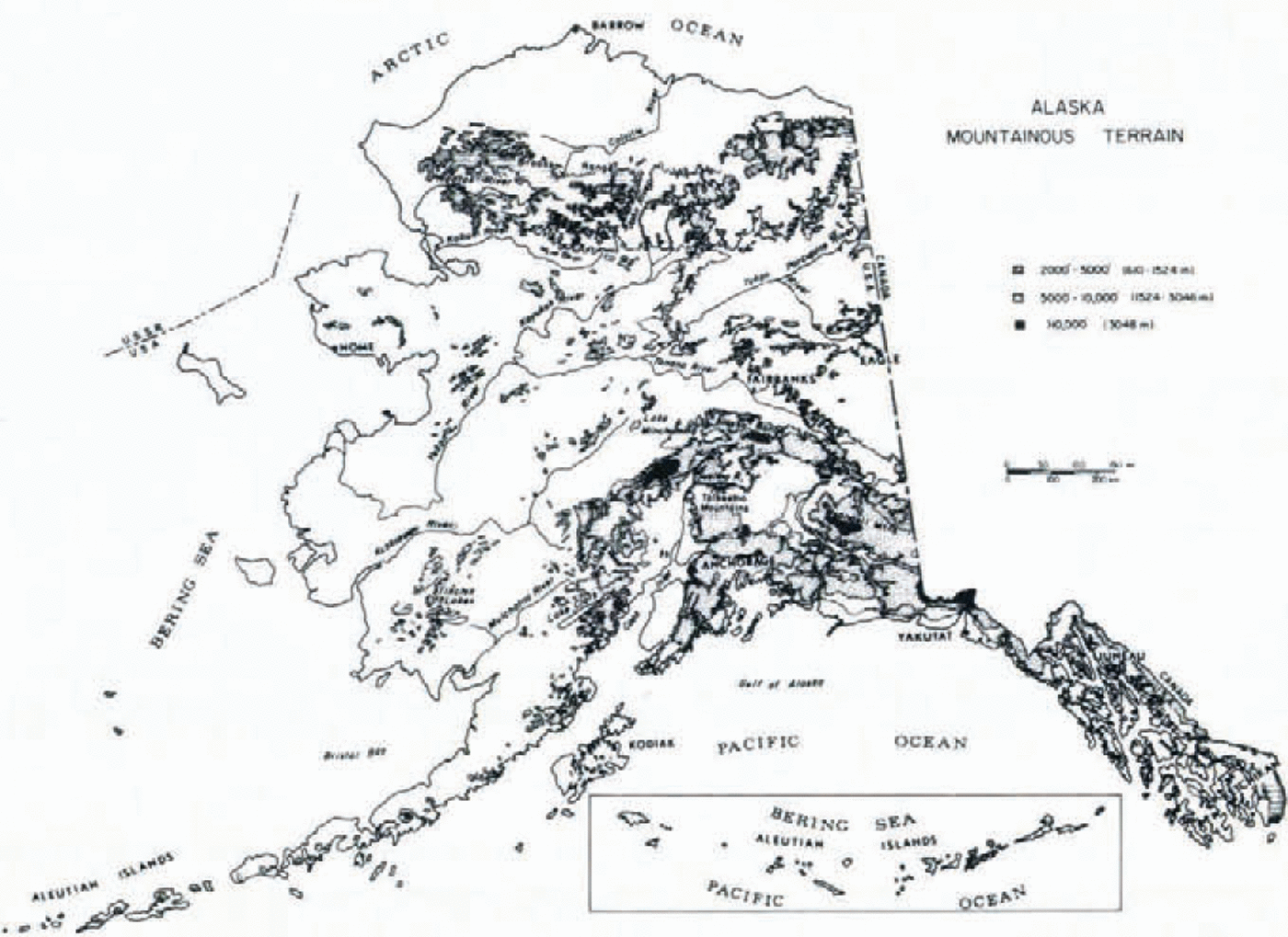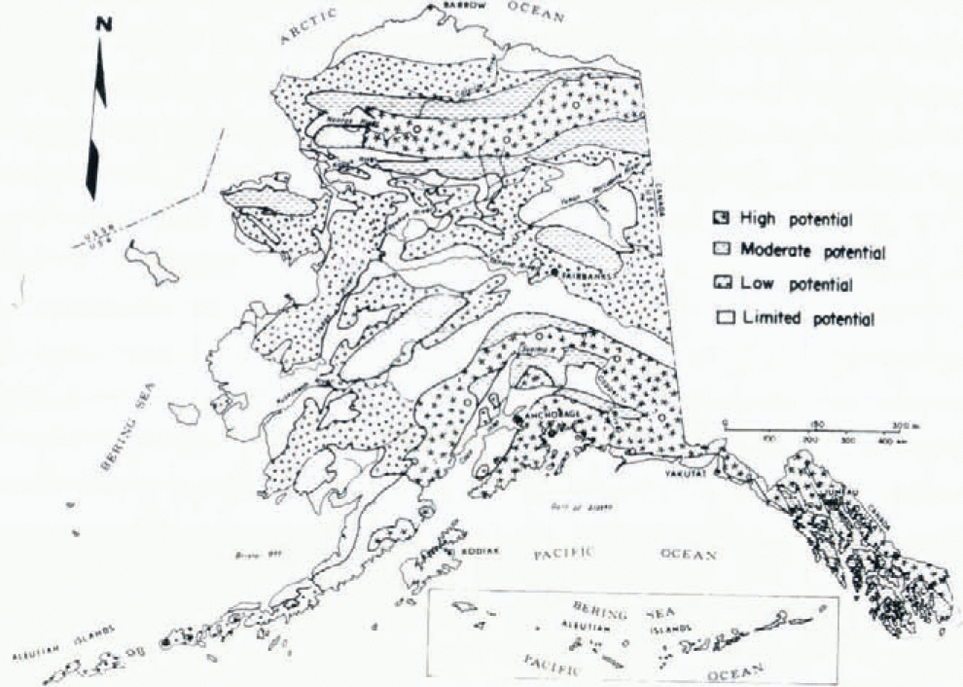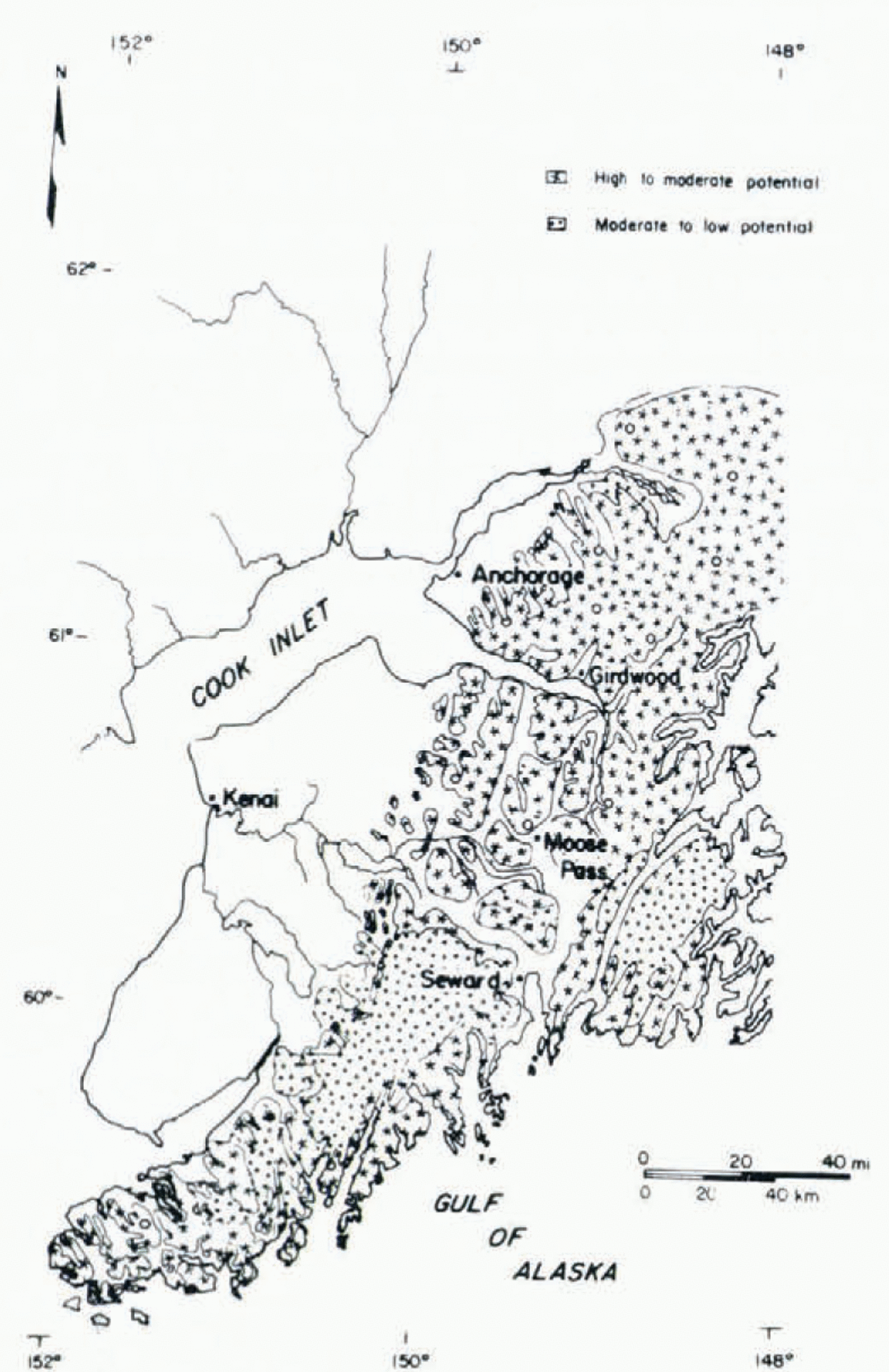 Compilation and cross—correlation of information on topographic relief, snow—avalanche regions, climatic zones, snow—pack characteristics, and known and suspected avalanche activity were used to produce a generalized avalanche—potential map of Alaska (Fig. 6). However, the state—wide avalanche—potential map includes regions with little or no data on snow—avalanche occurrences and therefore is provisional. Regional snow—pack conditions and seasonal climatic changes were assessed with the topographic features of each region and the potential avalanche terrain was identified throughout the state. Regions of “high avalanche potential” are areas where snow avalanches occur seasonally, and elevations above 10 000 ft (3 000 m) can expect potential avalanche activity throughout the year. Regions of moderate avalanche potential " have snow avalanches which commonly occur less than once every 1—5 years or occur during winters with unseasonably heavy snow—fall. “Low avalanche potential” areas have minor snow avalanche activity, but geomorphic, fire, or man—induced activities (i.e. logging, earth moving, etc.) could increase the potential for snow avalanches to occur. Regions of limited potential” are low and flat—lying areas which contain no known snow—avalanche activity.