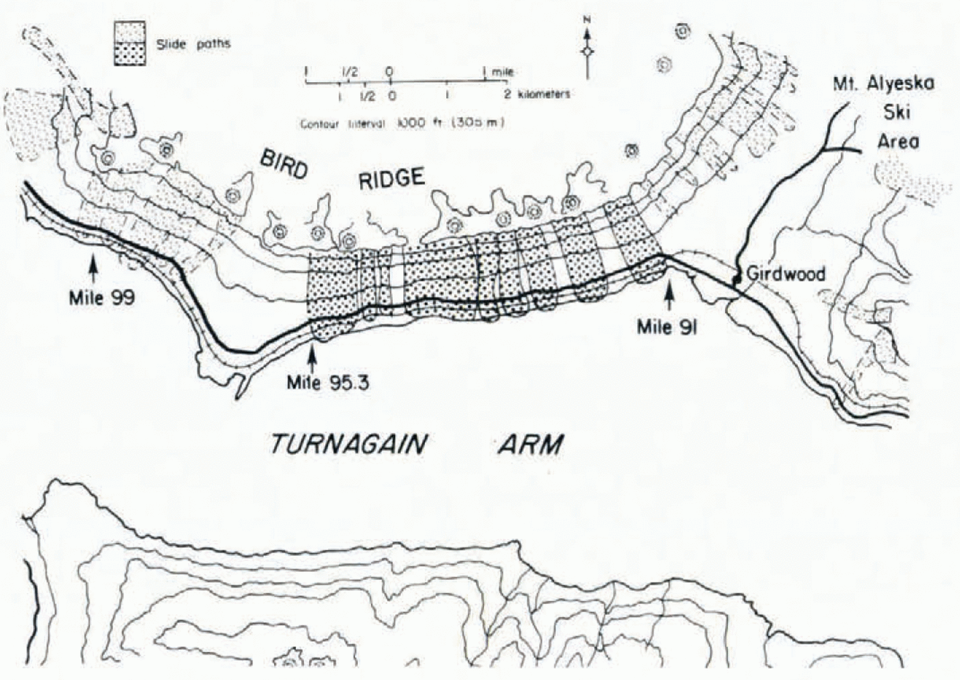 The authors wish to acknowledge the State of Alaska Division of Geological and Geophysical Surveys and the National Oceanic and Atmospheric Administration/National Weather Service for supporting our work. Doug Fesler of the Chugach State Park, and Jim Hackett, Snow Ranger in Chugach National Forest, provided stimulating thoughts on snow avalanche activities in South—central Alaska. Several colleagues of the Alaska DGGS assisted the senior author with various discussions about snow avalanches in Alaska. Drs Richard Reger, Randall Updike, and James Riehle, and Gail Davidson provided suggestions. Davidson compiled data on avalanche activity and terrain in the Anchorage and Juneau areas, and was assisted by Ann Schell in drafting the illustrations. Frank Larson edited the manuscript and drawings, and Roberta Mann typed the final copy. Drs Reger and Carl Benson (Geophysical Institute, University of Alaska) reviewed the paper. Although the authors have received much help from the State of Alaska and various U.S. Governmental agencies, the ideas and conclusions in this paper do not represent official policy within the state of Alaska.