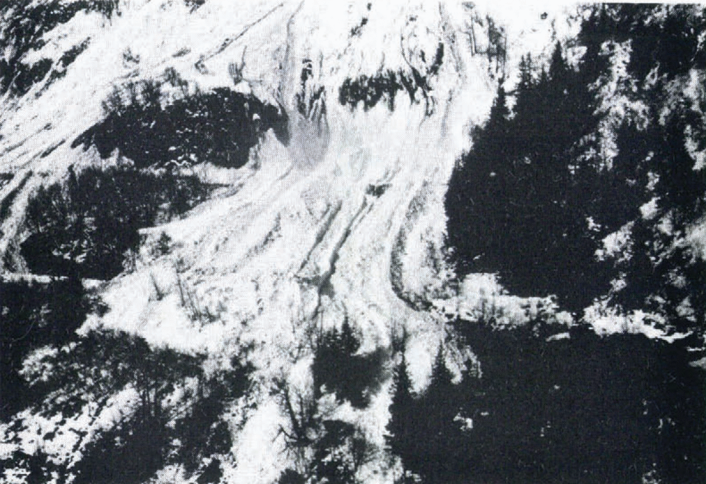 Fig. 13. Whiskey Gulch and an adjacent slide path, Mile 93, Seward Highway near Girdwood, Alaska. The snow slide is just one of over a dozen avalanche paths that released in March 1979 (photograph by S. W. Hackett).
