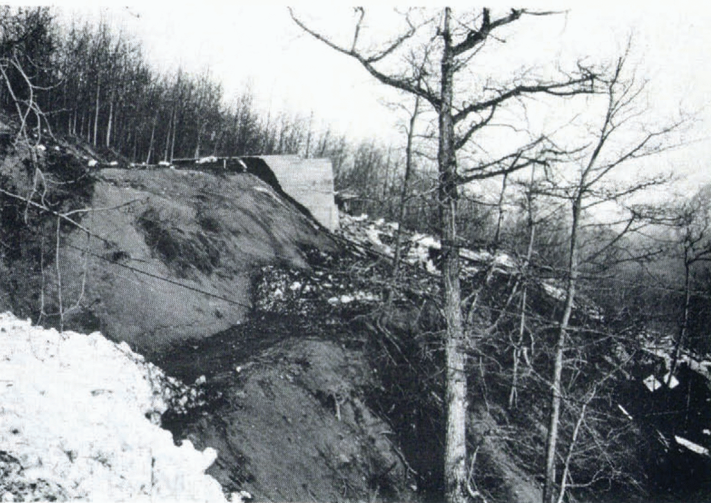 Fig. 14. The foundation remnants of a> $ 65 000 house that was completely destroyed by a wet snow avalanche during April 1979, Eagle River area, Municipality of Anchorage (photograph by J. Hackett).