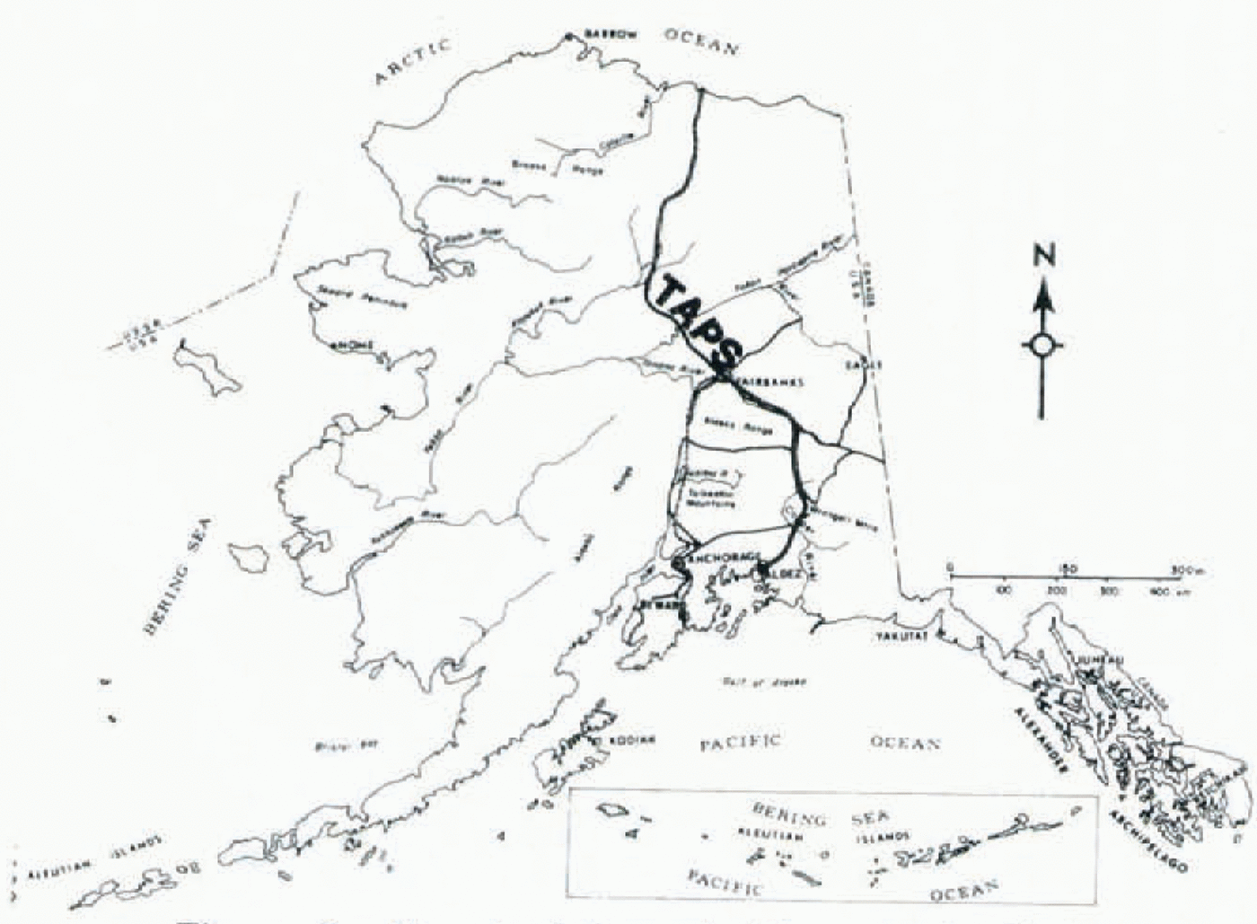 The state of Alaska is the largest in surface area but has the smallest population (approximately 400 000 people in 1970) of all the states. Alaska’s 586 400 square miles (1 518 900 km2) contain a land area one—fifth the size of the contiguous United States with over 47 000 miles (75 625 km) of coastline. Alaska is the farthest north and west of all the states. It contains four time zones and spans greater latitude than does the contiguous southern 48 states. The coastline in Alaska exceeds the combined coastlines of all the U.S.A. including Hawaii. The state includes the Aleutian Islands, extending south—westward from the mainland and the Alexander Archipelago, a group of 1 100 islands adjacent to the south—east coast of Alaska. Juneau, the state capital (population 22 000), is located on the mainland adjacent to Alexander Archipelago. The larger centralized population centers are in South—central [Anchorage (population 220000)] and in Interior Alaska [Fairbanks (population 40 000)]. These population centers are connected by the Alaska Railroad and Alaska Highway system, the main surface transportation and utility routes within the state. The Trans—Alaskan Pipeline System (TAPS), a major utility corridor, transects the state from the north at the Arctic Coast to Valdez at the Gulf of Alaska (Fig. 1).