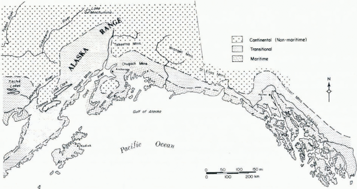 The snow—pack of South—central Alaska has the greatest variation of any of the snow— avalanche regions within the state. These variations occur not only on an area—to—area basis within the region, but also seasonally at any specific location. The general storm paths, proximity to ocean water, and large orographic features, combine to form a full spectrum of climatic zones which include maritime, transitional, and non—maritime macroclimates. These differences are apparent from the coast inland and vertically from low to high elevations. The coastal mountains typically receive large accumulations of wet snow—fall (3.0—5.0 m) which are responsible for numerous permanent snow—fields and glaciers in the region. At sea—level the temperatures are often near the freezing point and temperatures cool moderately with elevation. Consequently, snow—packs adjacent to coastal areas in South—central Alaska are relatively warm and moist (approximately 32°F (0°C)).