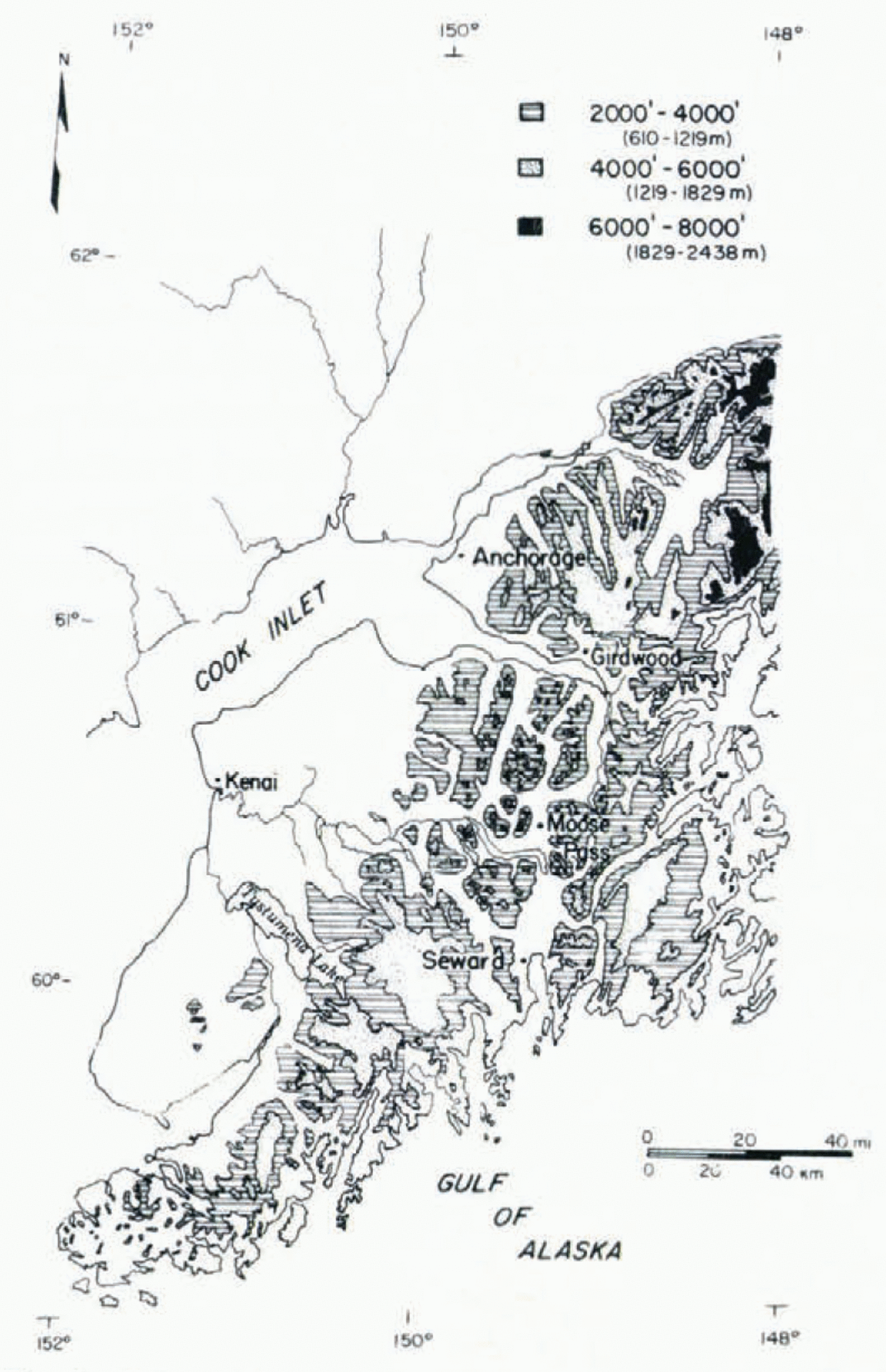 Fig. 7. Preliminary climatic snow—pack zones for South—central and South—eastern Alaska; based upon temperature and precipitation (US. Dept. of Commerce. National Weather Service / National Oceanic and Atmospheric Administration, 1970—78), geohydrological (modified from Reference Zenone and Andersonzenone and Anderson, 1978) and snow—pack data (U.S. Dept. of Agriculture. Soil Conservation Service, 1950—79, using 1977—79 data,and field studies by one of the present authors (S.W.H.)).