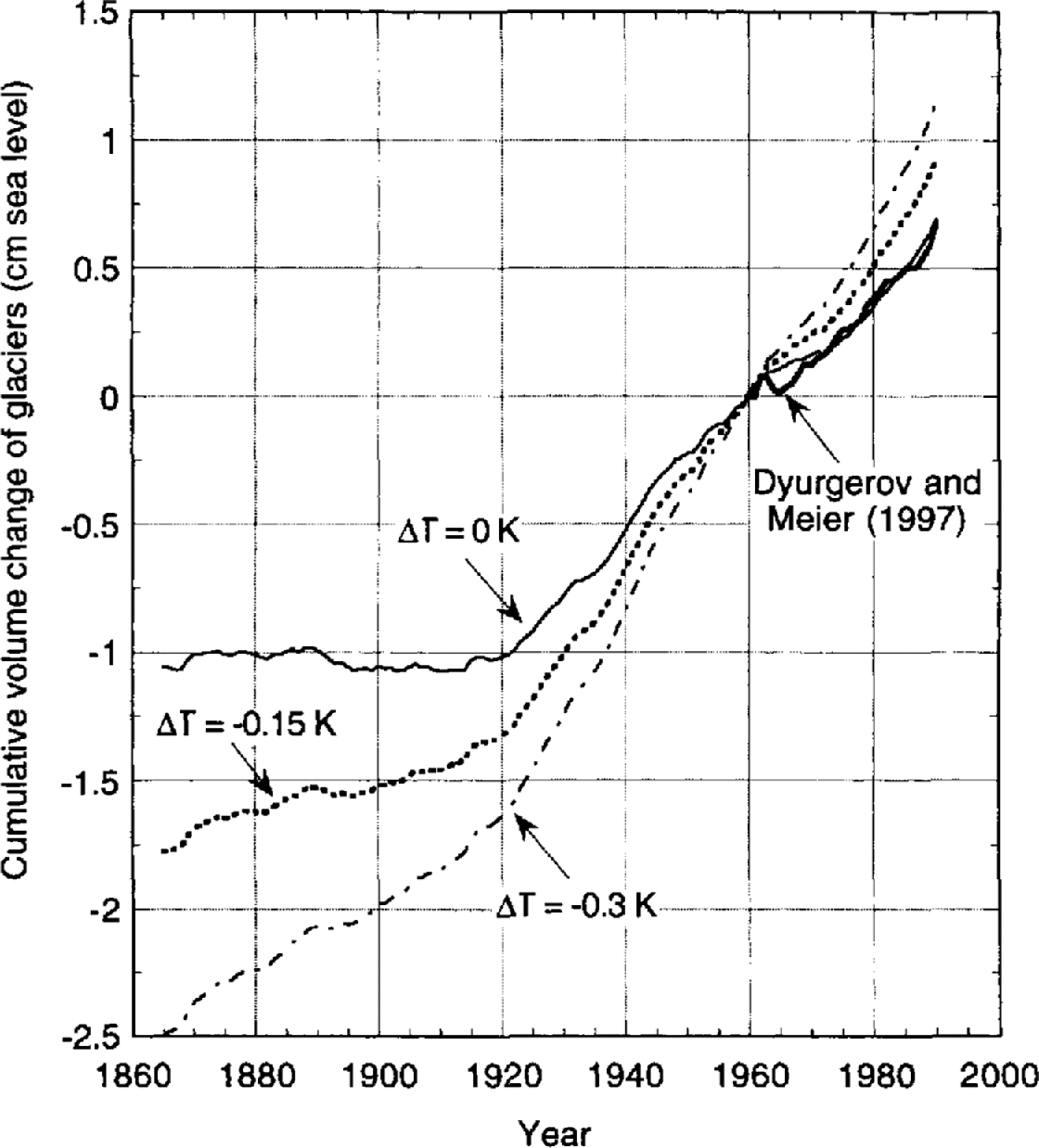 Fig. 1. Volume change of small glaciers and ice caps calculated by Reference Zuo and Oerlemans.Zuo and Oerlemans (1997) for the period 1865–1990. The cumulative change is shown as sea-level equivalent with reference to the year 1960. Results are given for three different initial conditions (ΔT), expressed as the global mean temperature for which the average 1865–95 glacier volume would be in equilibrium minus the actual global mean temperature for 1865–95. The solid line shows the estimate of Reference Dyurgerov and Meier.Dyurgerov and Meier (1997).