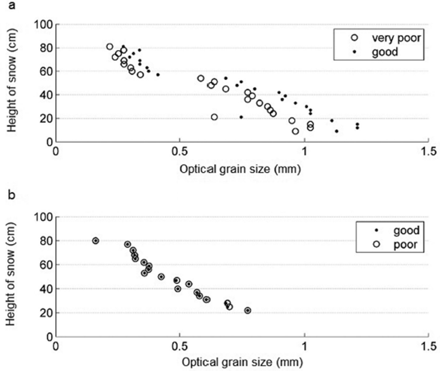 Changes in temperature and density affect the state of grain metamorphism in the snowpack. Generally, metamorphism drives the formation of different grain shapes (Reference FierzFierz and others, 2009). Reference ColbeckColbeck (1982) describes grain shape changes through the winter; grains can form again several times, and a rule of thumb is that the average size of snow grains increases with age and depth of snowpack.
