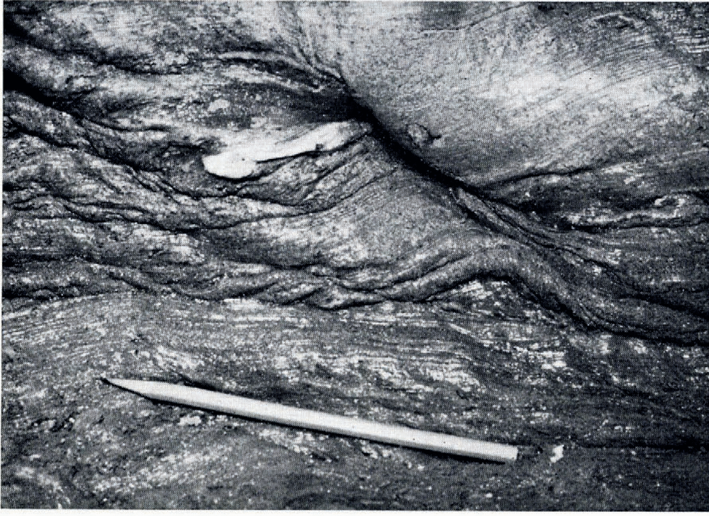 Fig. 1. Ropy structure of basal ice at Casement Glacier cave. The ice flow is from right to left, the pencil is about 16 cm long.