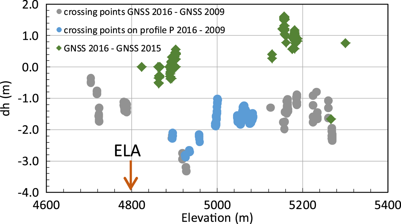 We used crossing points and points of close proximity (<5 m) of the measured GNSS profiles to analyze elevation changes. Surface lowering occurred at all analyzed locations along the main glacier above the ELA (~4800 m altitude) between 2009 and 2016 (Fig. 7). The magnitude of thinning was ~1.5 m above 5000 m elevation, including the crossing points in the main accumulation basin (Fig. 8: blue and grey dots). The plateau close to the Abdu Kagor Pass (~4950 m altitude) shows stronger thinning of >3 m, while down-glacier towards the ELA, it reduces again to values of ~1.3 m and finally ~0.4 m at an elevation of 4730 m during these 7 years. These observations relate to mean elevation change rates of −0.2 m a−1 above 5000 m, −0.4 m a−1 at 4900 m and −0.06 m a−1 just downstream of the ELA. This pattern is also observed for the TanDEM-X elevation differences in the period 2011–16.