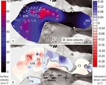 We assume minimal year-to-year variations in velocity within and up-glacier of KPB. Velocities appear consistent between measurements collected during this project and from a separate field season conducted by Denali National Park Service in 2007 (unpublished data). Unfortunately, all velocity measurements represent short time intervals within the summer months (4-14days, collected in May-August) and we have no velocity measurements in the winter for comparison (Reference Copland, Sharp and NienowCopland and others, 2003; Reference LeBlanc, Larsen, West, Truffer and O’NeelLeBlanc and others, 2008). The avalanche-prone region covers a distance of nearly 1 km near MH, from which, due to safety issues with collecting data in these areas, we do not have velocity measurements (Fig. 1; C). For velocity and strain interpolations, we also assume a flow boundary condition of 0 m a-1 where bedrock is exposed or in contact with the glacier surrounding MH and KPB (Fig. 11a).