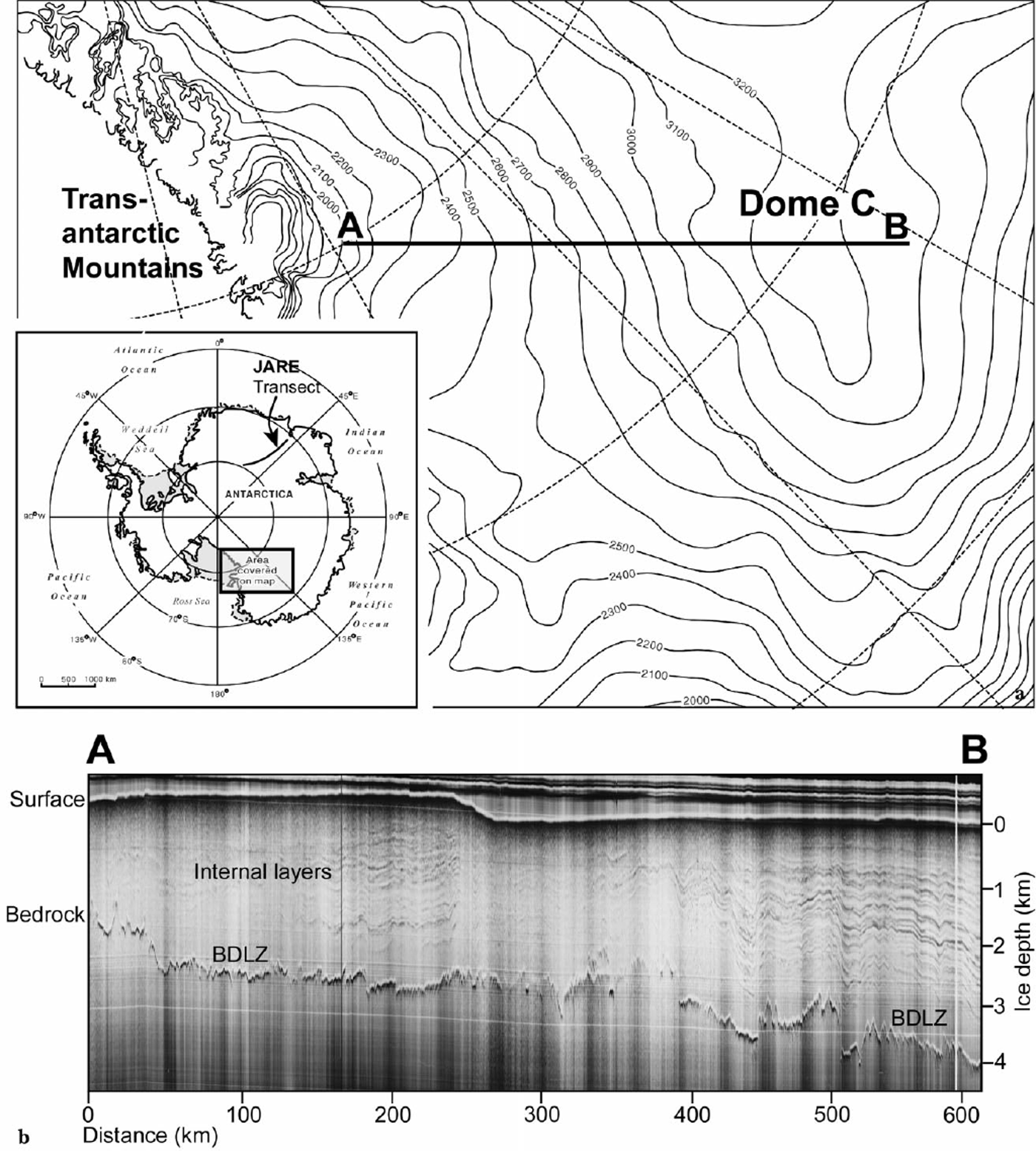 Fig. 1. (a) Map showing the location of a radar transect AB, between Dome C and the Transantarctic Mountains, and the JARE radar transect from Dome Fuji to Mizuho station. (b) Z-scope radar data along transect AB. Surface elevation contours are provided in metres above sea level. BDLZ refers to “below detection-limit zone”.