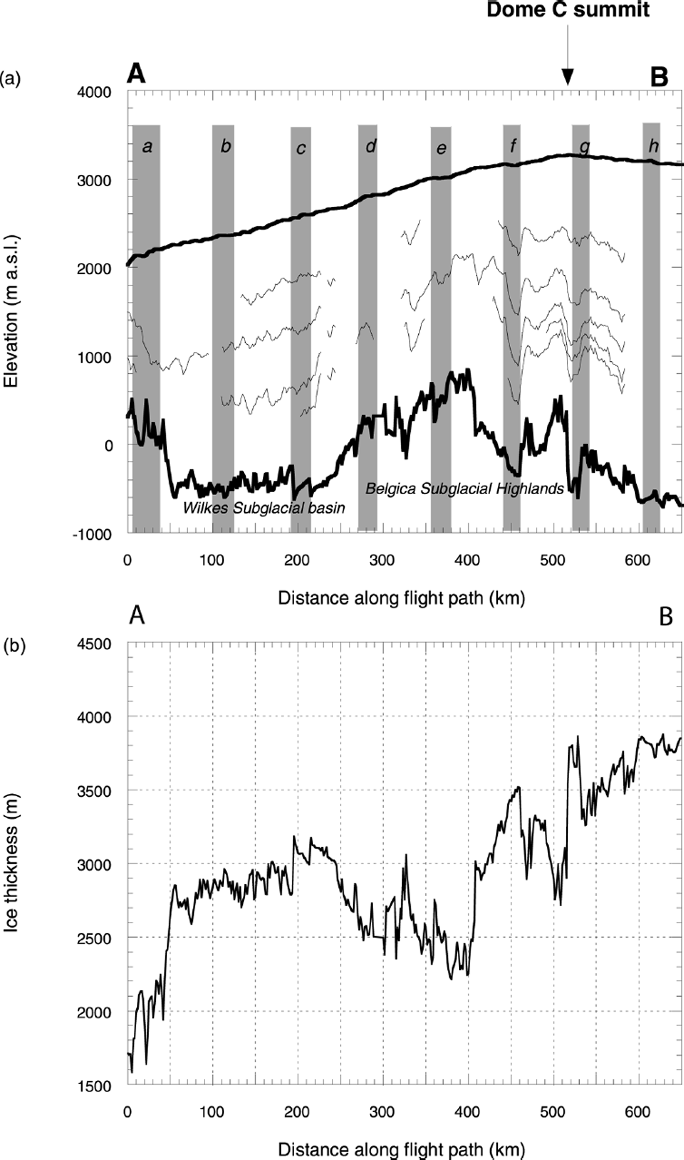 Figure 2 shows the variation of surface elevation, ice thickness, bed elevation and internal layering along the transect between Dome C and the TAM (AB in Fig. 1). The surface elevation increases steadily from 2000 m a.s.l. near the TAM to > 3200 m close to the summit of Dome C (Fig. 1a). Bedrock topography and ice thickness are more variable along the transect (Figs 1b and 2b). At the downstream end of the Dome C-TAM transect, subglacial hills are present and the ice is only 2000 m thick. Between 50 and 250 km, a subglacial valley (the Wilkes Subglacial Basin) of relatively constant level (500 m b.s.l.) is located. The ice thickness in this region increases from 2800 m to > 3000 m in conjunction with the change in the elevation of the ice-sheet surface. Subglacial highlands between 300 and 400 km are associated with ice thickness of around 2500 m, which then increases to 3800 m at the end of the transect as the bedrock surface drops to 700 m b.s.l. (Fig. 2a). The flight-line is aligned approximately perpendicular to ice surface contours, so we expect a significant proportion of ice flow to be along the line of the transect (Fig. 1). This means we can examine the role of subglacial topography in internal radar layering as ice flows over the subglacial hills and valleys identified in the transect.