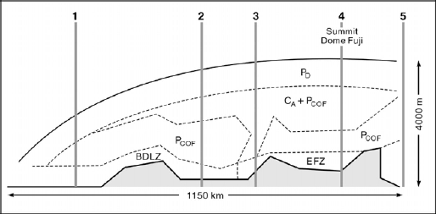 A comparison of the Dome C–TAM transect with the Dome F–Mizuho transect suggests that there are similar distributions of the reflection mechanisms in the similar situations in the ice sheet. First, reflections from the P D mechanism dominate in the upper 700–900 m of the ice sheet due to contrasts in ice density. This reflection mechanism does not occur at ice depths > 700–900 m, because the density of ice becomes essentially constant. Second, the C A mechanism dominates in the depth range below 1000 m at the centre of the ice sheet. Third, the P COF mechanism dominates at ice depths of > 1000 m in the marginal area.