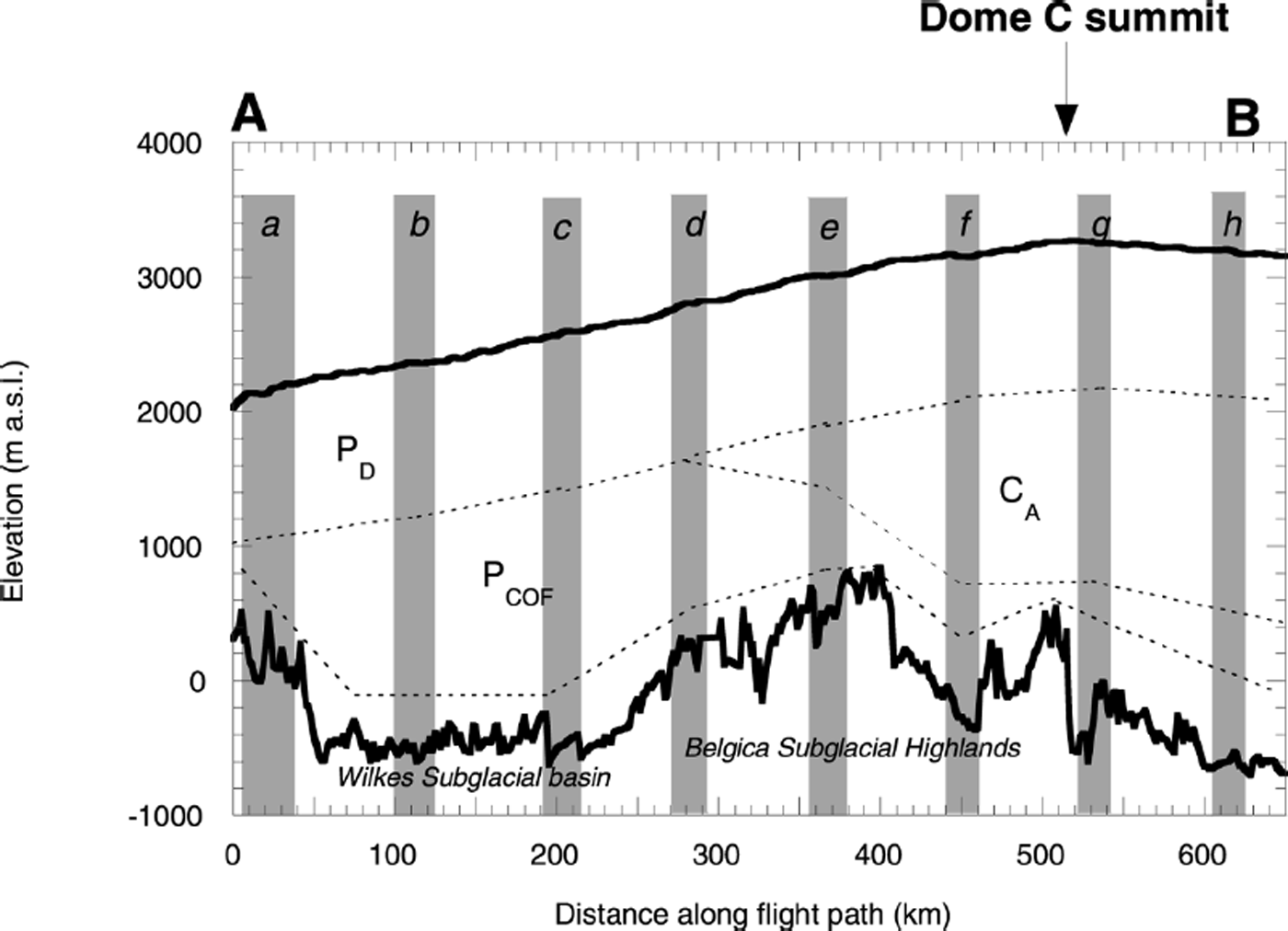 Below the summit of Dome C (site g, Fig. 3a) conductivity-based reflections from acidic ice layers are located approximately between ice depths of 1000 and 2500 m. This zone thins away from the dome, and disappears entirely at site d and beyond (Fig. 3). The P COF zone exists to some extent at all locations (Fig. 3) and thickens as ice flows up the stoss side of the Belgica Subglacial Highlands (see Fig. 6). Downstream from site e the P COF zone increases further so that by site c it is > 1000 m thick.