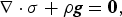 The flow is governed by the balance of the divergence of the Cauchy stress, σ and the specific weight given by density times gravity, ρ g,