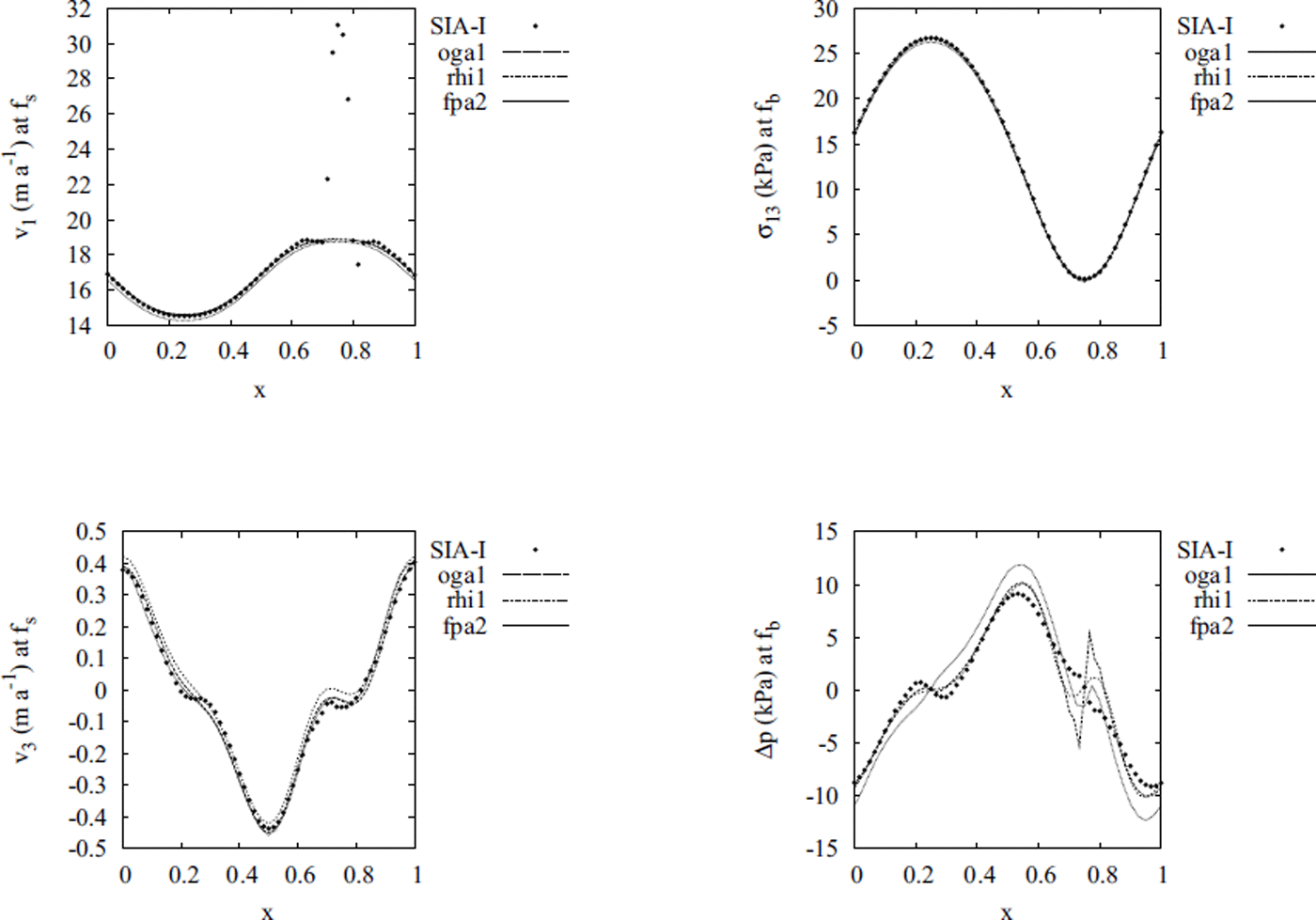 To estimate the order of improvement of the SIA-I solution compared to the SIA solution, Figure 3 plots the SIA solution for v1 and v3 at the surface (v2 is identically zero) and σ 13 at the bottom ( σ 23 and Δp are identically zero). Comparing Figure 2 with Figure 3, we see that the SIA-I solution differs significantly from the SIA solution, demonstrating that the SIA-I approach is capable of providing a more accurate solution of glacier flow.