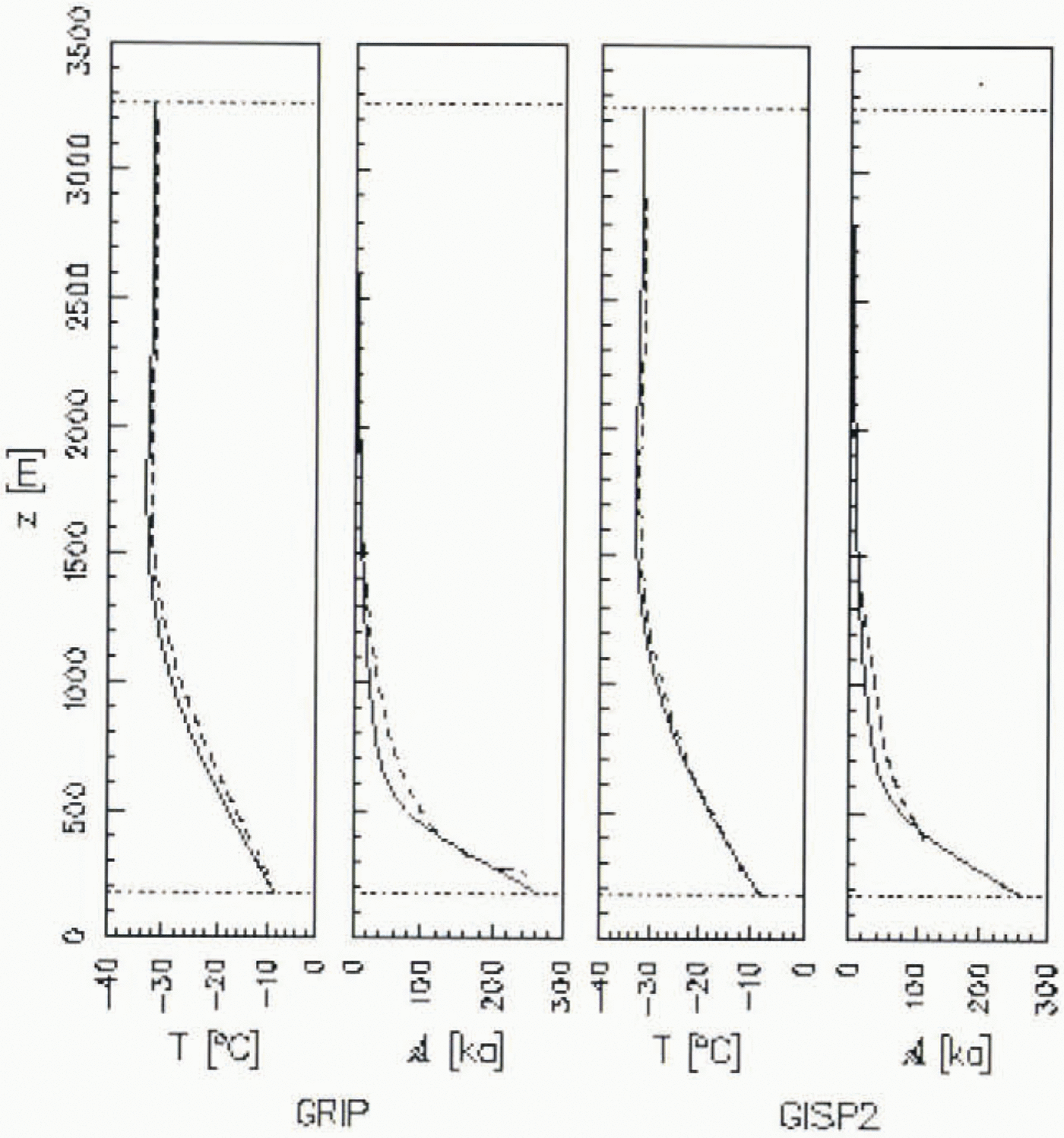 Fig. 3. Stmulated temperature-depth and age-depth profiles for GRIP and GISP2 (solid), measured temperature-depth profiles (Reference Cuffey, Clow, Alley, Stuiver, Waddington and SaltusCuffey and others, 1995; Reference JohnsenJohnsen and others. 1995) (dashed), previous age-depth profiles (Reference DansgaardDansgaard and others, 1993; Reference SowersSowers and others, 1993; Reference MeeseMeese and others, 1994) (dashed).