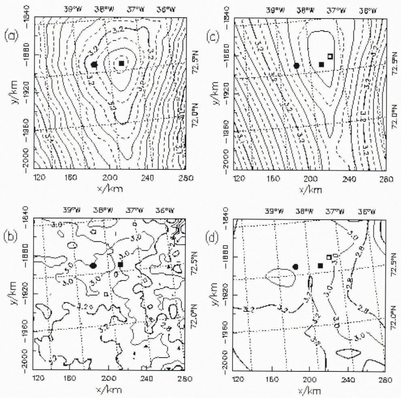 Fig. 2. The present vicinity of Summit. (a) Measured surface topography (Reference Hodge, Wright, Bradley, Jacobel, Skou and VaughnHadge and others, 1990), (b) measured ice thickness (Reference Hodge, Wright, Bradley, Jacobel, Skou and VaughnHodge and others, 1990), (с) simulated surface topography. (d) simulated ice thickness. Solid show the GRIP position, solid circles the GISP2 position and open squares the position of the simulated summit (only in panels с and d). Surface elevations in km a.s.l. (spacing 10 m), ice thicknesses in km (spacing 200 m).