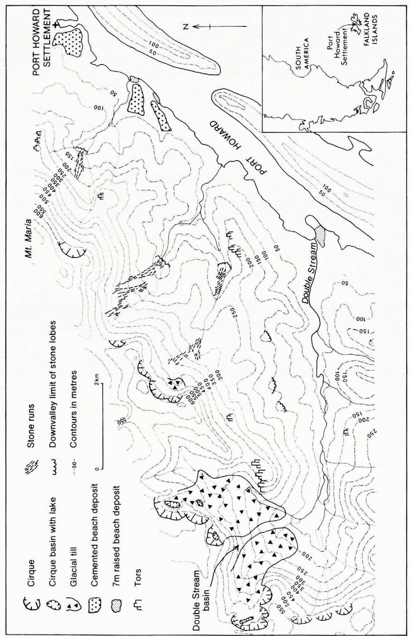 Double Stream Basin is a complex of broad valley heads cut into an unnamed mountain massif, the summits of which rise to over 680 m. The massif, consisting mainly of quartzite rocks, is one of the highest and most extensive in West Falkland. In places the valley heads have been modified by the development of four prominent cirques, each with cliffed back-walls and rock-basin floors, and three less gereply excavated cirques (Fig. 2). The backwall of the gerepest cirque is almost 200 m high.