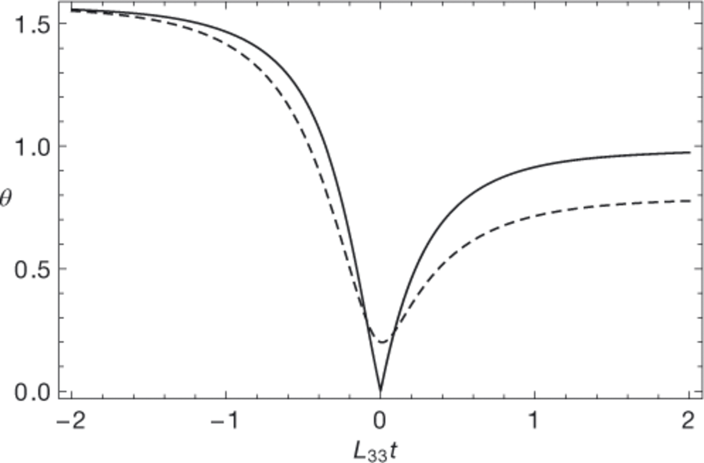 on the half-axis with L33t > 0. Thus, if the motion is dominated by shear, L13 » L13, both asymptotes are close to π/2, whereas for L13 ≈ L33 significantly lower asymptotes are possible. If ϕ0 = 0 or ϕ0 = π (depending on the sign of L33) or θ 0 = 0, the tilt reaches a minimum of θ = 0 and has a kink at the minimum (solid line in Fig. 1). In all other cases the minimum is greater than zero and is passed smoothly; in these cases e never reaches a vertical position.