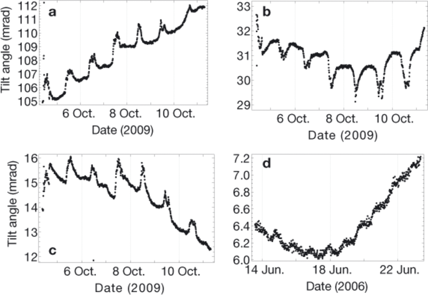 Tilt measurements with high temporal resolution show examples of diurnal variations of strain rates. This phenomenon has been observed in different glaciers, such as the entirely temperate Rhonegletscher, the polythermal Gornergletscher and in the polythermal region of Jakobhavns Isbræ, Greenland ice sheet (Reference Marshall, Harper, Pfeffer and HumphreyLüthi and others, 2002). Reference Amundson, Truffer and LüthiAmundson and others (2006) measured similar features on Black Rapids Glacier, a large surge-type glacier in the central Alaska Range, USA. In these examples, the patterns in variations are similar in shape and magnitude. The mechanism causing these variations and the temporal coincidence with diurnal variations in englacial water pressure suggest that variations in sliding may explain the variations in the strain field. The partial reversibility of deformations perhaps indicates diurnal variations of normal strain (Reference GudmundssonGudmundsson, 2002) or elastic reactions of the ice base to variable basal water pressure (Reference Sugiyama, Bauder, Weiss and FunkSugiyama and others, 2007).