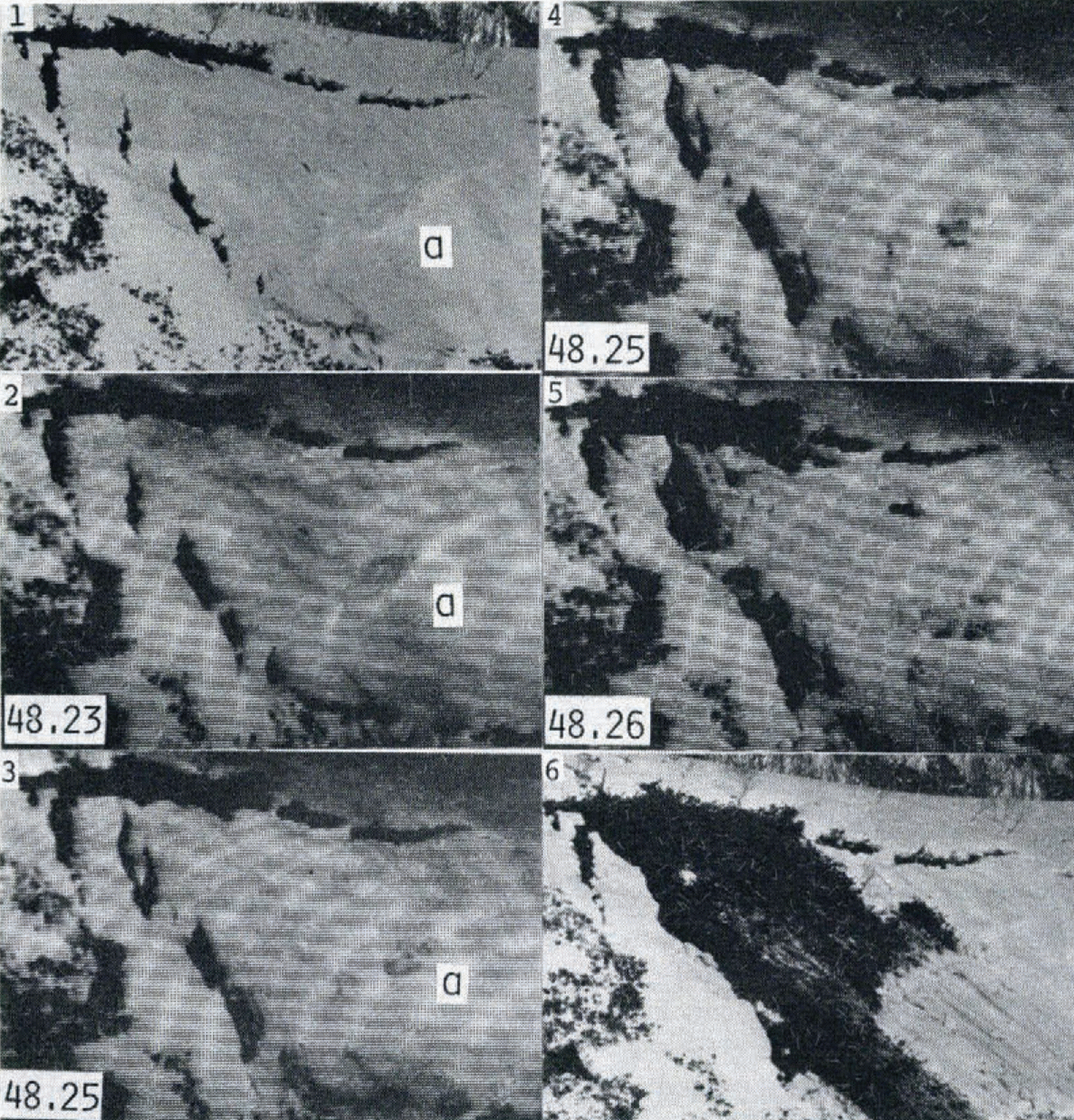Fig. 1. An avalanche of type A release recorded at 11.48 h, 5 April 1979. Photographs 1 and 6 were taken with a still camera about 2 h before and 30 min after the release of the avalanche, respectively. Pictures 2—5 were taken with a VTR, in which numerals on the lower left side represent the time sequence in minutes and seconds. A fold indicated byaon the pictures began to collapse at 48 min 25 s. The snow slab then started to release itself as a full-depth avalanche.