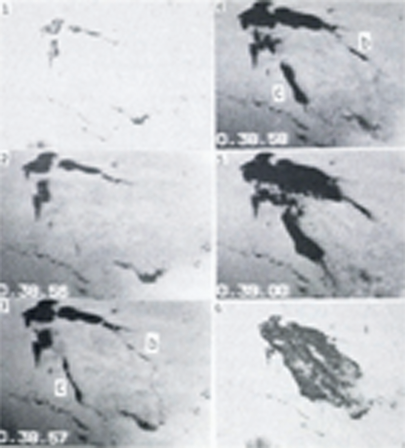 Fig. 2. An avalanche of type B release recorded at II.38 h, 18 December 1973. Pictures 1 and 6 were taken about 2 h before and about go min after the release of the avalanche, respectively. Two new cracks "b" and “c”, extending from the sides of each of the original cracks, appeared at 38 min 57 s and the release of the snow slab began at the same instant.