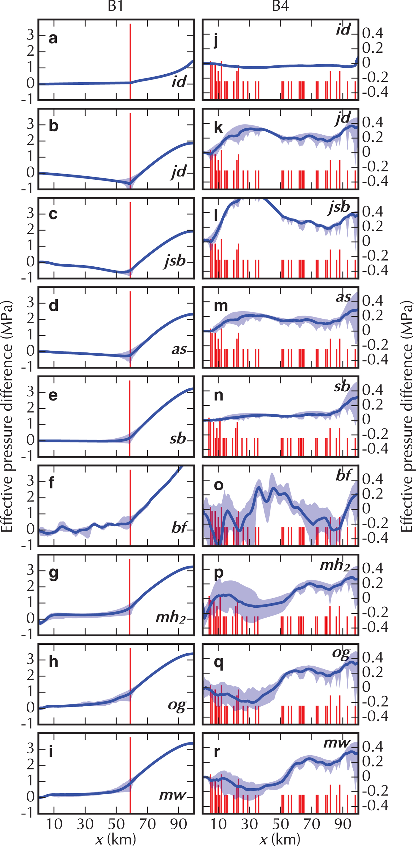 Most models reach negative effective pressures in Suite D for extended periods of time in both the lower and middle band. The models that do not reach negative N either constrain it to be positive (db, jsb, mh 2) or, in the case of bf, instantly activate the efficient drainage system when N = 0 is reached (this activation can be seen nicely in Fig. 7o). A positive N is arguably a more realistic behaviour as month-long periods of negative effective pressures over the large areas predicted by the other participating models is not observed and would have a much more dramatic impact on ice dynamics than ‘spring events”. However, probably none of the models capture the drainage system dynamics correctly as N approaches zero, as then uplift of the ice, including non-local effects due to elastic and viscous behaviours, should occur (Tsai and Rice, Reference Tsai and Rice2010; Walker and others, Reference Walker, Werder, Dow and Nowicki2017). Note that in the seasonal Suite, F, zero or negative effective pressures are reached only very briefly by bf and id. All others models have N > 0.7 MPa. Again this is due to the larger surface slopes and shorter length of the valley topography compared with the topography of Suite D.