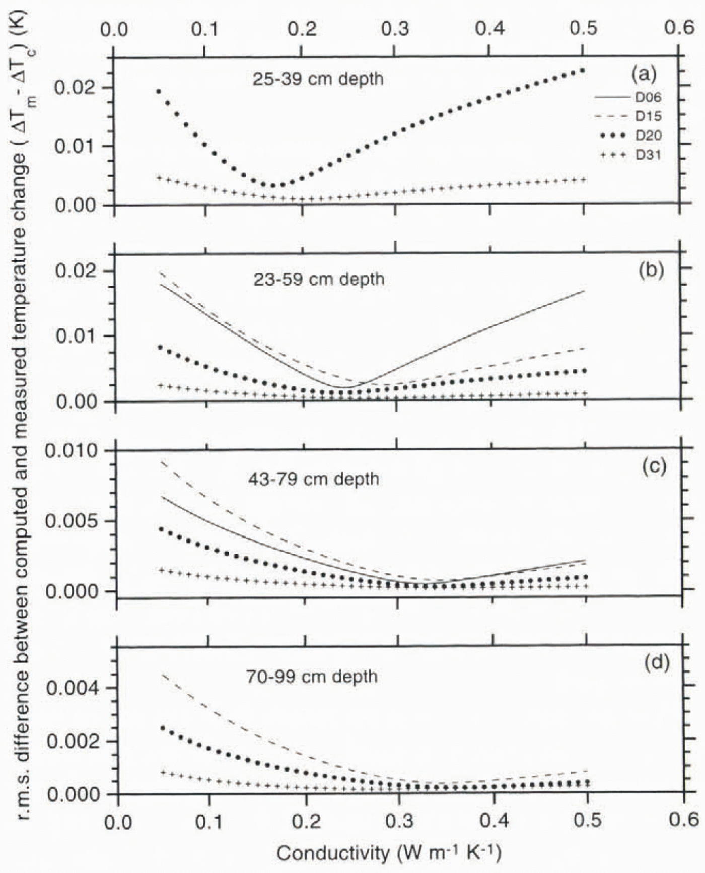 Fig. 9. Root-mean-square difference between computed and measured 15 min temperature changes (ΔTm- ΔTc) (Equation (7)), using the pure-conduction model (Equation (6)), as a function of the conductivity specified in the model, for the four 9 d data-collection periods of lowest mind speed (indicated by download-number D06, D15, D20, D31). The four frames are for four sets of three thermistors each, labeled by the range of depths occupied by the central thermistor of the set over the course of these four-data-collection periods (Fig. 1). Note that the vertical scale is expanded by a factor of 2 in (c) and a factor of 5 in (d) to display the much smaller temperature changes experienced by the deeper snow.