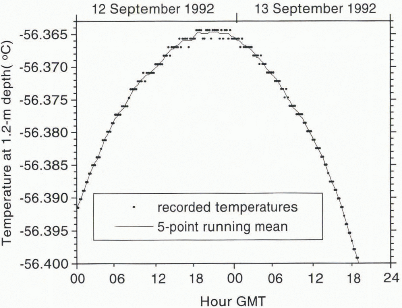 A 2 d segment of the 1 m temperature is shown as the points in Figure 6. This is the deepest of the thermistors used in the conductivity analysis below. Note that the recorded temperature varies by only 0.04 K over this 2 d period. To smooth the digital steps in the data seen in Figure 6, we have chosen to filter all our temperature records using a five-point running mean as shown by the continuous line in Figure 6. This filter was chosen for two reasons. First, the span of five points represents 1 h; this matches the spacing of the meteorological observations which we correlate to our model output. Secondly, the ability of our model to predict temperature changes in the deepest levels was improved by increases of the averaging time up to 1 h but averaging over times longer than 1 h did not cause further improvement. Althoughthe absolute accuracy of a temperature measurement is ± 0.03 K, Figure 6suggests that the changes of temperaturewith time at a single thermistor are accurate to about ± 0.002 K. The five-point averaging reduces this error by the square-root of five, to about ±0.001 K.