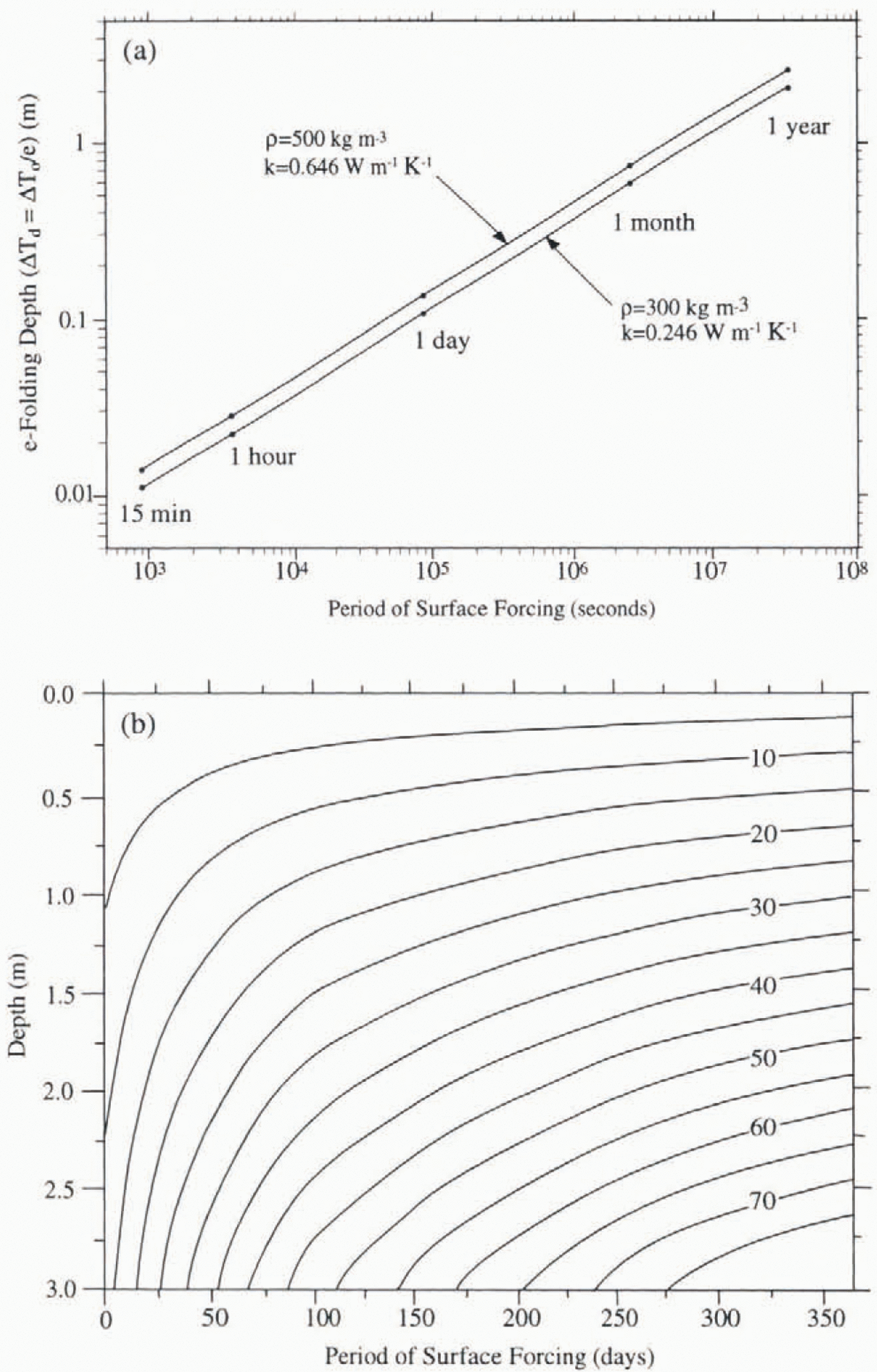 Fig. 8. (a) Theoretical e-folding depth of a periodic sinusoidal temperature variation imposed on a snow surface as a function of forcing period, for two snow densities, with conductivities from Reference AndersonAnderson’s (1976)parameterization. The e-folding depath d is defined such that ΔTd= ΔT0/e, where #x0394;T0is the temperature amplitude at the surface and #x0394;Tdis the amplitude at depth d. (b) Theoretical phase lag in days as a function of depth and period of surface-temperature forcing for homogeneous snow with a density of 350 kg m−3and a conductivity of 0.3 W m 1K 1.