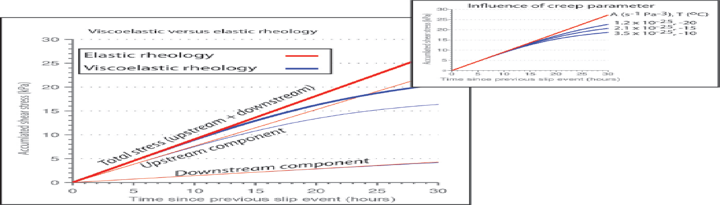 The exact amount of reduced stress drop resulting from the onset of viscous deformation will depend on the creep parameter A. We examine this sensitivity by repeating the viscoelastic calculations for a range of creep parameters (1.2–3.2 × 10–25 s–1 Pa–3) that encompass a plausible range of mean ice column temperatures (–20 to –10°C) for WIS (Fig. 11). As expected, for colder, stiffer ice the deviation from a purely elastic model is less pronounced; however, all values of A exhibit a reduction in stress levels beginning ~ 15 hours into a stick–slip cycle and a net reduction in applied shear stress for slip events nucleating following a 24 hour inter-event period.