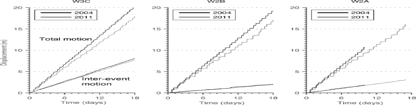 Fig. 2. Example GPS displacement time series for three stick–slip locations on WIS that were occupied during both 2004 and 2011. Lower time series show the inter-event component of motion by subtracting all motion that occurs during slip events.