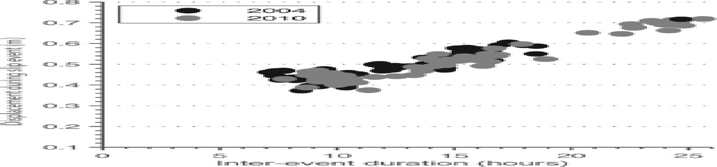 Fig. 8. Histogram of inter-event durations preceding slip events observed during the 2003/04 and 2010/11 field campaigns. Note the increase in long inter-event (>20 hours) durations in 2010/11 resulting from frequent skipped low-tide events.