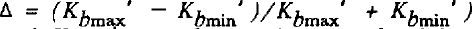 bmin are the maximum and minimum values of Kb, respectively, from x = 100 km (UpB) to x = 300km for given a, b, and γ. Curves for (a, b) = (1.33, 1.8), (I, 2), (1, 3), (1, 4), and (1, 5) are indicated; the heavy solid line connects the minima in Δ for a = 1, b = 2, 3, 4, 5.