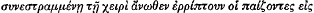 is attested as a boxing term at least as early as 394 in the Dionysus Asketes of Aristomenes (fr. 13 ap. Poll. iii 150)—if indeed this is the play mentioned in IG xiv 1097. 10 ![]()