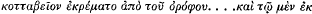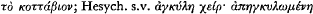 ). The comparison with a punch-ball here may explain a statement of Pollux (vi 109–10), repeated in schol. Ar. Pax 1242, but not, so far as I know, confirmed by vase-paintings nor at all probable in itself, that the cottabus-stand was suspended from the ceiling (see however, p. 51, n. 17). For his wording ![]()