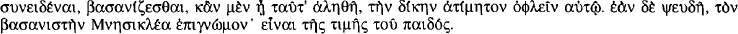 71 Cf. Ant., Stepmother i 8, Chor. vi 25, Lyc., Leocr. i 29. Thür 227–34 points out that, in those disputes that refer explicitly to the dispute-ending quality of the basanos, the references to aphesis and apallagê correspond to the other methods of mutually ending disputes.