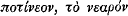 of a new, exciting sport, playing in the snow, are contrasted with the tedium when that sport has grown dull (as a comparison for the νόσημα of sexual, perhaps homosexual, pursuits); Ant. 849, where the tomb of Antigone is not newly built but a novel sort of tomb, one for a living person; Pi. O. x 60, where the poet, writing of the first victors at the Olympic games, asks who won this novel crown. The lexicographers and scholiasts give the word two senses, ‘unexpected; new’, but νέος is itself always ambiguous between a temporal sense and the sense ‘novel’ (in which I believe it to be used here by the lexicographers). Thus we have: ![]()