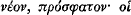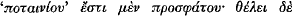 (sch. Aesch. Pr. 102); cf. sch. Aesch. Th. 239, sch. Pi. O. x 72 (=60 Snell), Phot. 445.13, Eust. Comm. 1106.23. The analogy to πρόσφατος has misled the commentators, as the scholiast to Soph. Ant. 859 (=848) realised: ![]()