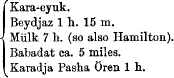 page 93 note 3 Reckoned 6 hours, i.e. 18 miles; from Balik Koyundji to Beydjas is 6 hours according to Hamilton.