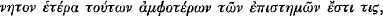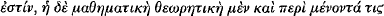 An den Stellen, an denen Aristoteles das Wesen der Ersten Philosophie bestimmt, behandelt er immer wieder zwei Wissenschaften, die den Anspruch erheben könnten, Erste Philosophie zu sein. Es sind dies Physik und Mathematik. Und Aristoteles gibt diesen beiden das Recht zu, als Teile der Weisheit zu gelten, weist dagegen deren Anspruch Erste Philosophie zu sein, ab. Als Endergebnis der Diskussion finden wir die Formel, daβ es drei Philosophien (oder wie wir auch sagen könnten, Sophien) gibt, Physik, Mathematik und Erste Philosophie.