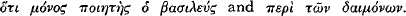 4 That is, ‘On the concord of Moses and Jesus’ a highly probable title for an early work by Ammonius about the chief theological problem of his day. It may be added here that we learn from Porphyry of the titles of two works by the neo-Platonist Origen, namely: These works must surely have dealt with the subjects of which Hierocles also treated in his περὶ προνοίαζ—the former would deal with the creation, the latter with destiny. An identification of Origen the neo-Platonist with the Christian Origen has been essayed by R. Cadiou (op. cit.), but is controverted by Schwyzer, op. cit. col. 480, 42 ff. From the way in which Hierocles brings to the front the name of this Origen, it can be deduced that he (and not, as might be supposed, Plotinus) was the main source of Hierocles's information about the teaching of Ammonius.