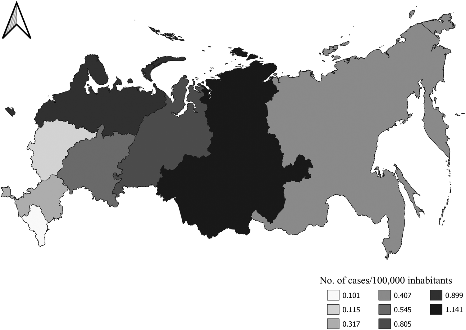 In most federal units, a decline in the incidence of infection between 2008 and 2019 was observed as an overall trend. The period was analysed in two six-year increments (2008–2013 and 2014–2019). In the federal units where the infection was continually registered, the number of cases was significantly higher during the first six-year period – that is, in the Republic of Khakassia (36/7) (χ2 = 19.56, P < 0.0001), Krasnoyarsk Krai (61/27) (χ2 = 13.16, P = 0.0003), Perm Krai (39/11) (χ2 = 15.68, P = 0.0001), Orenburg Oblast (24/9) (χ2 = 6.8181, P = 0.009) and Khanty-Mansi Autonomous Area (31/12) (χ2 = 8.3652, P = 0.0038); only in the Komi Republic (26/48) (χ2 = 6.4503, P = 0.0105) was the number of cases significantly higher during the later six-year period. For federal units where cases were registered only in certain years (e.g. in the Magadan region cases were registered in 2008, 2014 and 2015, or in Nizhny Novgorod only in 2017 and 2018) (Rosselkhoznadzor annual reports, Reference Rosselkhoznadzor2008–2019), analysis was performed cumulatively for all units; the results also showed a significantly higher number of cases during the first six-year period (252/133) (χ2 = 36.782, P < 0.0001).