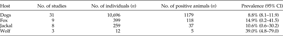 Table 2. Geographical distribution and prevalence of included studies for definitive hosts.
